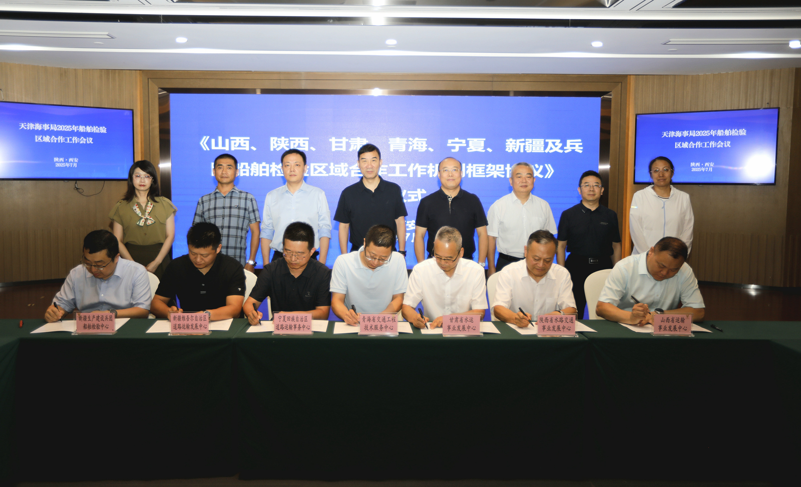 宁夏新闻网讯(记者 胡俊)近日,天津海事局组织召开2025年船舶检验区域合作工作会。会上,宁夏道路运输事务中心与山西、甘肃、青海、新疆及新疆生产建设兵团的船检机构代表共同签署《山西、陕西、甘肃、青海、宁夏、新疆及兵团船舶检验区域合作工作机制框架协议》。