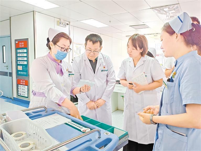 吴忠市人民医院柔性引进中央博士服务团成员郝盼盼(左二)在检查指导临床科室规范药品管理。