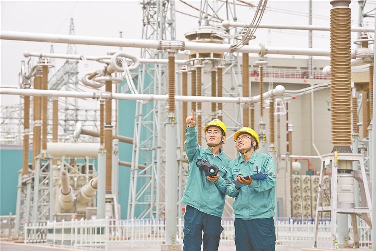 换流站内,工作人员使用热成像仪进行安全巡检。记者 王猛 摄