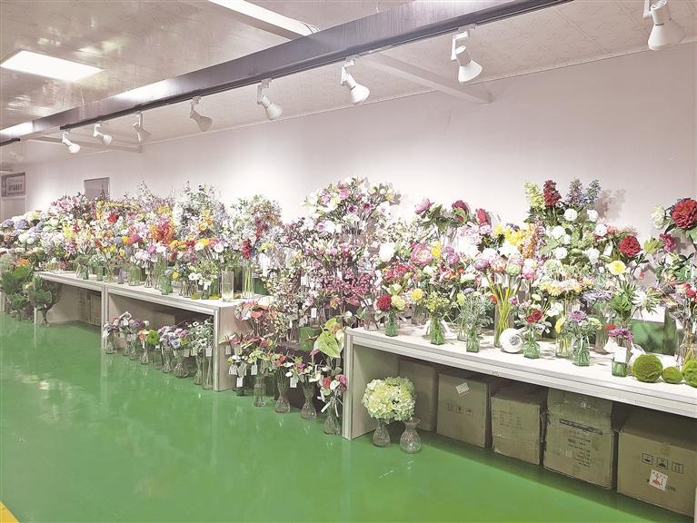 隆德人造花工艺有限公司展厅里摆放着姹紫嫣红的仿真花。