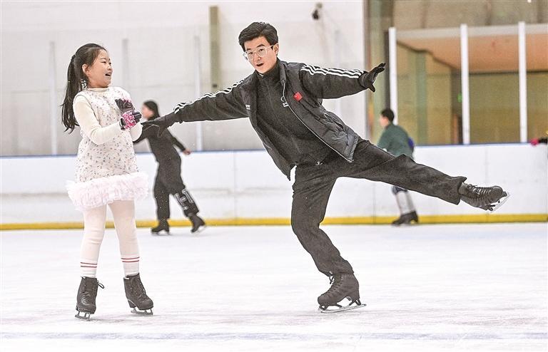 银川市阅彩城冠军冰场,花样滑冰教练景学文(右)示范动作要领。