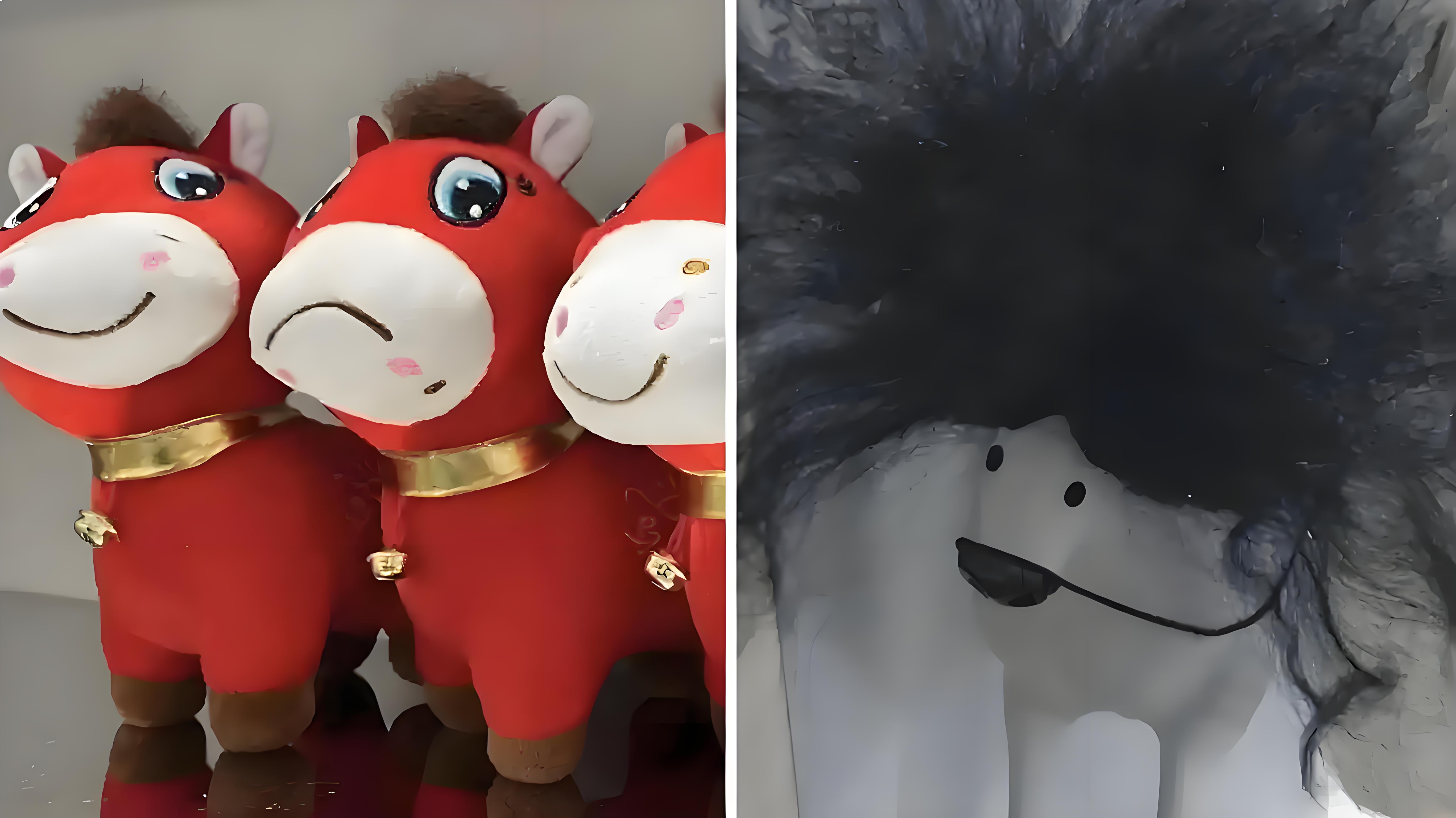 另一只是义乌出品的“哭哭马”,起因是网友分享购物体验时发现,一只马年公仔的嘴巴被缝反,原本该喜庆的造型尽显委屈,“笑笑马”意外变身为“哭哭马”。网友本想向商家反馈这一瑕疵,未曾想这份独特的“反差萌”戳中了大众,让这只“残次品”逆袭成为全网追捧的爆款。