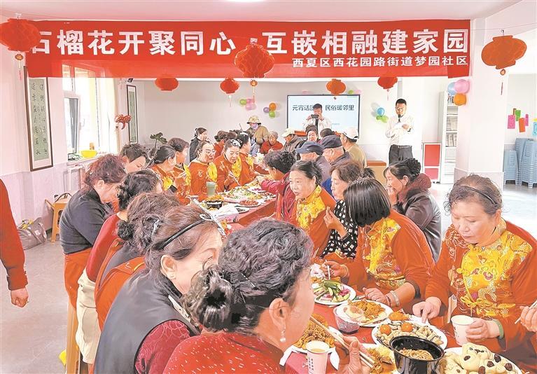 2月28日,银川市西夏区西花园路街道。在梦园社区的红石榴广场上,秧歌队队员身着盛装、舞动彩扇,孩子们在灯谜墙下跑来跑去。在“梦享会客厅”,“籽籽同心”长桌宴暖意融融。桌上摆满传统糕点、馓子油香以及各式菜肴,各族邻居们围坐在一起,尝美食、话家常。