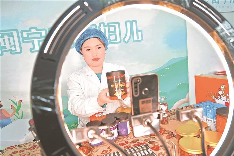 “喜欢的家人,赶紧下单,这款枸杞是我们直播间的明星产品。”3月8日,永宁县闽宁镇原隆村闽宁禾美电商帮扶车间,工人海燕对着直播镜头与网友互动、售卖当地特色产品。她所在的电商车间,旺季每天有1.5万件快递发往全国各地。