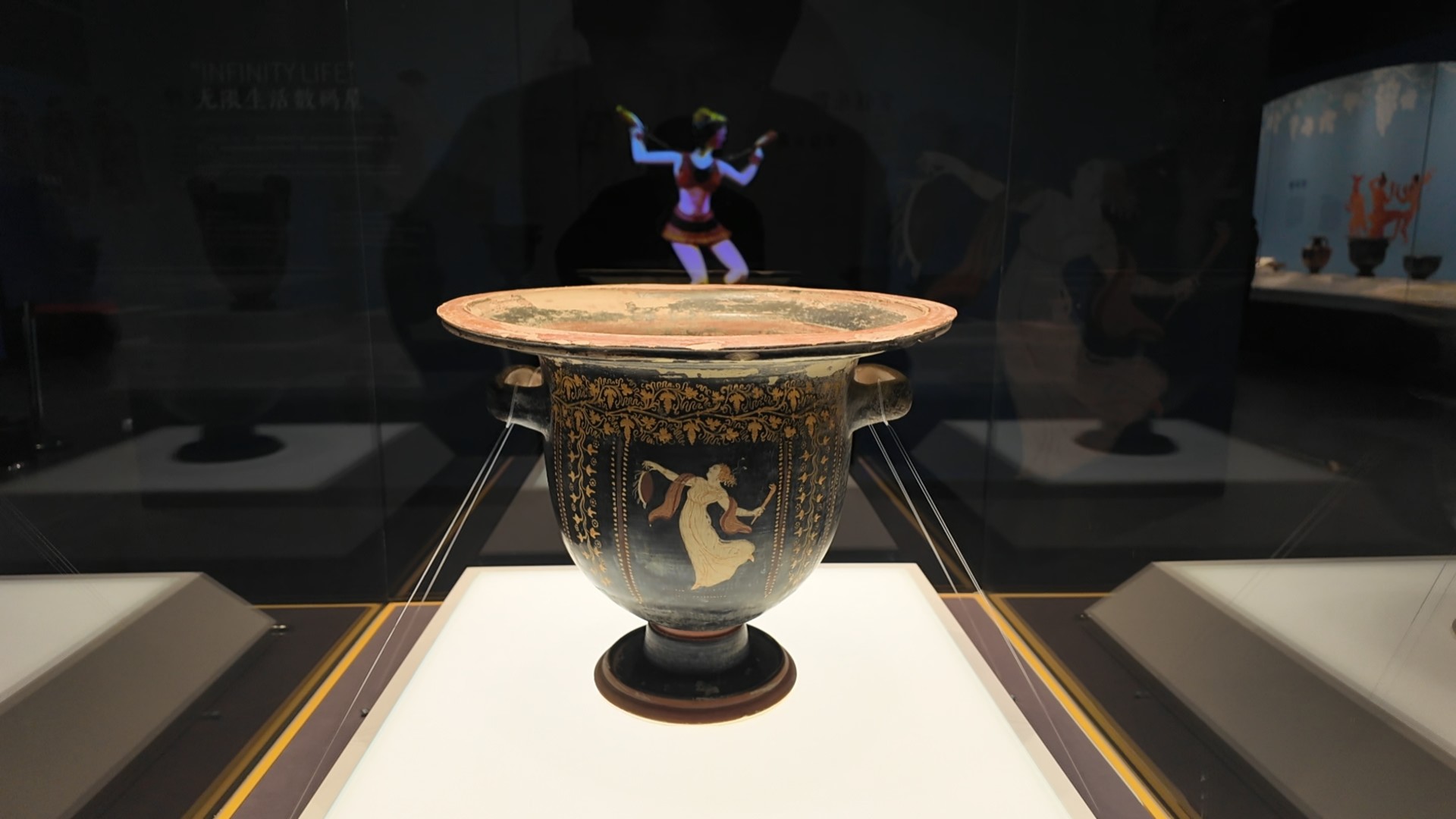 除了对古希腊与普利亚本土文化的呈现,展览还设有“东方的回响:丝路古道上的希腊记忆”单元,讲述了东西方文明通过丝绸之路相互交融的历史。宁夏固原出土的鎏金银壶等文物印证了古希腊神话故事在丝绸之路上的传播与演变,是东西方文明交融的珍贵见证。