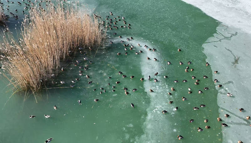 12月18日,彭阳县古城镇店洼水库,数以千计的野鸭等候鸟栖息于此“集体越冬”。 宁夏日报报业集团全媒体记者 常宽 见习记者 马国军 摄
