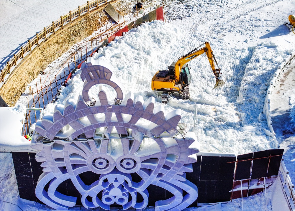 12月23日,“太阳神”造型已初具雏形。第四届贺兰山岩画冰峰节将于2026年1月中上旬启幕,目前,各项冰雕、雪景在紧张搭建中。记者 马楠 王洋 摄