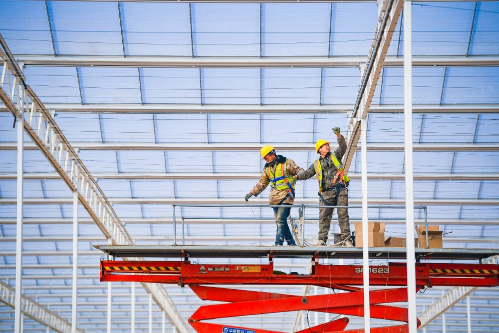 12月24日,贺兰县金贵镇江南新村现代设施农业温室项目现场,工人在升降机上安装棚内设施。作为贺兰县现代农业高质量发展重点工程,该项目规划总占地面积843亩,一期项目投产后,预计年产串收番茄3000吨,可提供100余个稳定就业岗位。记者 马楠 王洋 摄