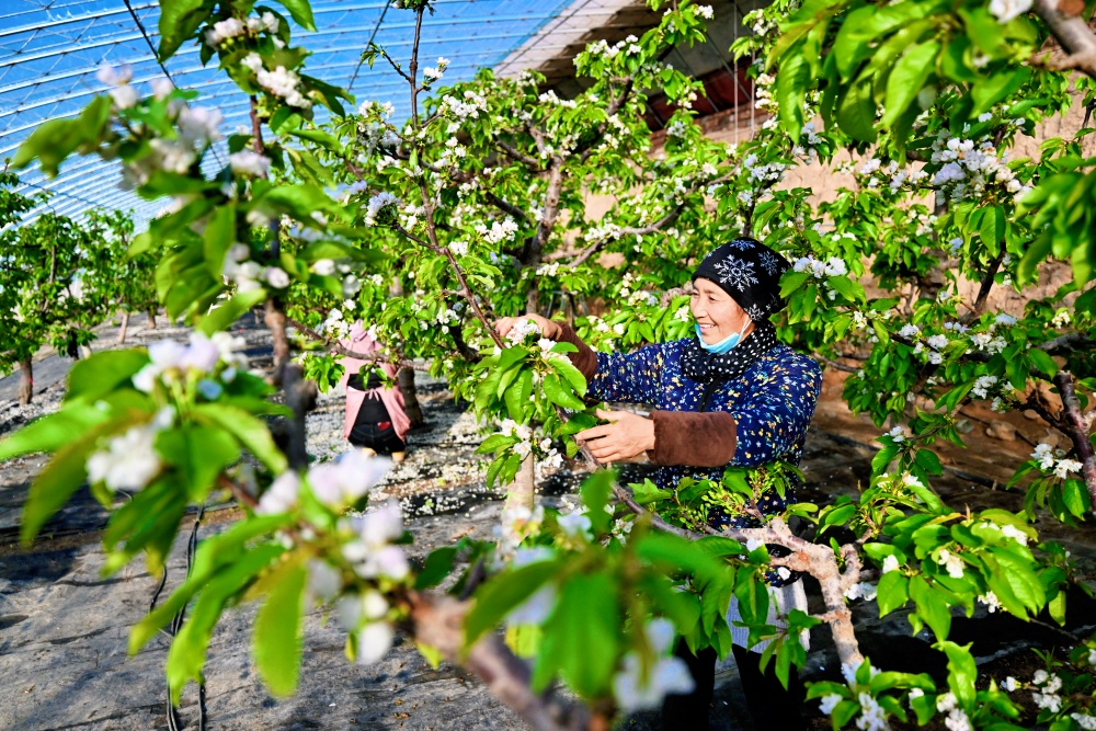 1月9日,贺兰县习岗镇新平园区峻松樱桃采摘园设施温棚内,农户在打理花株。园区通过智能温室调控、水肥一体化等技术,实现“南果北种”。贺兰县现有设施农业面积5.96万亩,“大棚经济”带动了部分群众增收致富。记者 马楠 马赛尔 摄