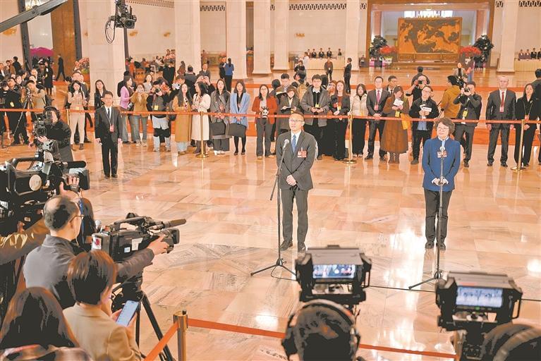 3月7日,全国政协十四届四次会议在人民大会堂举行第二场“委员通道”集中采访活动,住宁全国政协委员王小龙(中)亮相“委员通道”,讲述他与工业母机近30年的不解之缘。