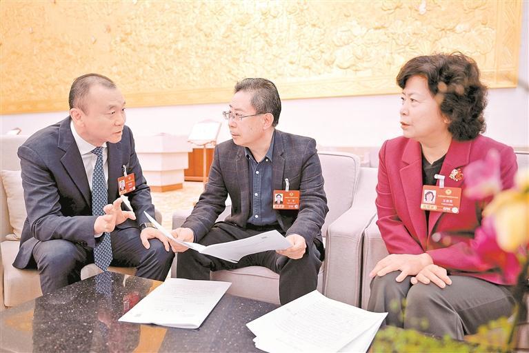 进入会场前,住宁全国政协委员刘建国(左)、李星(中)、王春秀(右)一起讨论政府工作报告。