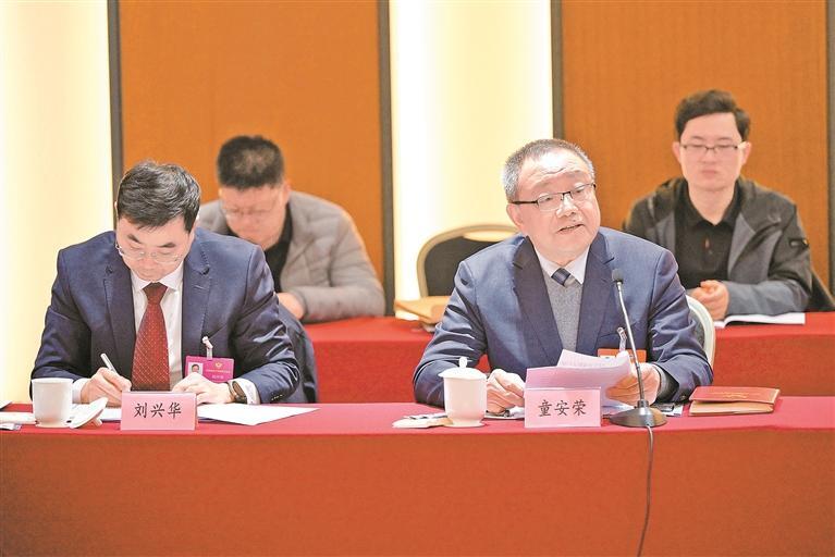 3月7日晚,住宁全国政协委员集中学习习近平总书记参加政协联组会时的重要讲话精神。会上,住宁全国政协委员童安荣(右一)畅谈现场聆听习近平总书记重要讲话的感受。