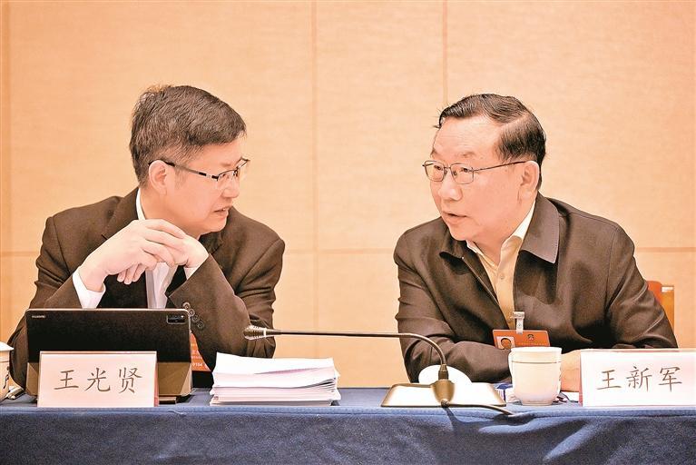 住宁全国政协委员王新军(右)与王光贤委员讨论“两高”工作报告。