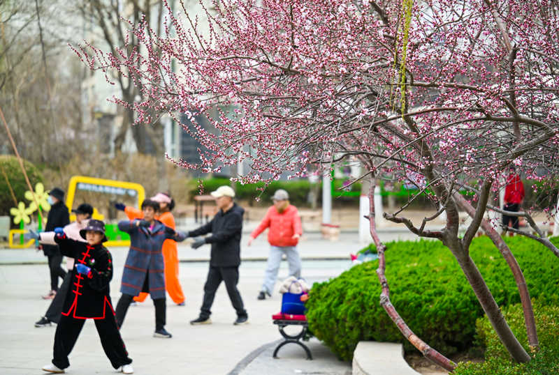 3月17日,人们在银川市金凤区民生城市花园小区晨练。近日,漫步银川,从小区庭院到公园湖畔,从城市广场到街角路旁,草木舒展、繁花似锦。近年来,银川持续厚植绿色家底,扎实推进绿化提质、湿地修复、环境治理,让蓝天常在、碧水长流、绿树成荫,生态宜居的幸福底色愈发鲜明。记者 马楠 王洋 摄