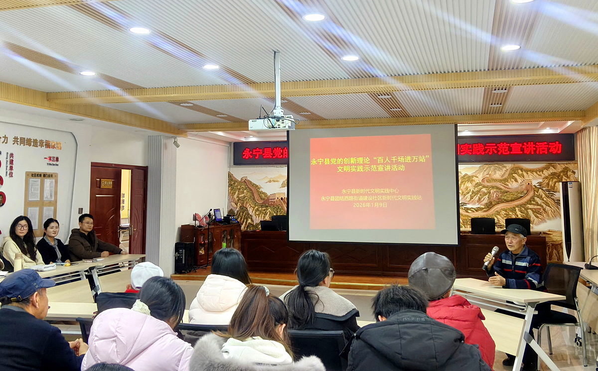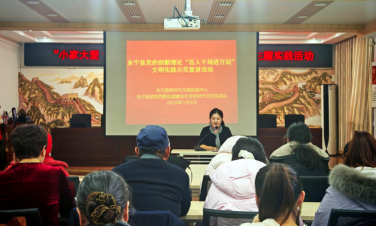 宁夏新闻网讯(记者 杨兆莲 文/图)1月9日,永宁县在团结西路街道建设社区新时代文明实践站举行党的创新理论“百人千场进万站”文明实践示范宣讲活动。活动以“小家大爱 让党的创新理论进入寻常百姓家”为主题,通过“观讲话、谈感悟、赏文艺、听故事”的多元形式,让党的创新理论以群众喜闻乐见的方式浸润人心,切实打通理论宣讲“最后一公里”。