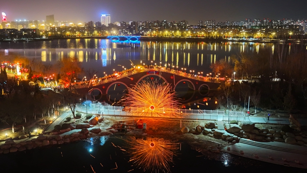 夜间联欢演出则坚持“民间为主、群众参与”的原则,多区域同步展演民乐、戏曲、舞蹈等节目,形成流动式文化场景,让传统艺术走出剧场、走向园区,实现公共空间的文化赋能。压轴登场的非遗打铁花表演,以火树银花之势点亮夜空。作为国家级非物质文化遗产代表性技艺,打铁花承载着民间匠艺精神与祈福文化象征,在海宝塔影下绽放出历史与当下交汇的光芒。