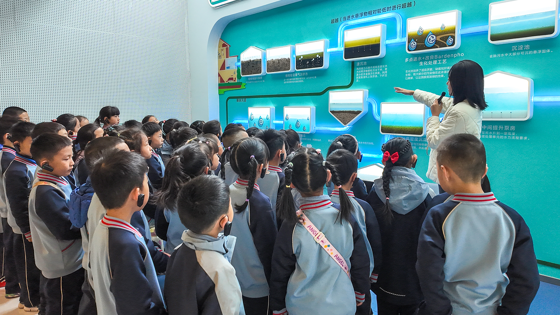 “污水中的微生物是怎么工作的?”“净化后的水能喝吗?”面对孩子们的提问,讲解员一一解答,用通俗易懂的语言讲解了“AAO+高效沉淀池+V型砂滤池”核心工艺原理。当看到原本浑浊的污水经过处理后,变成了清澈透明的再生水,并可直接用于城市绿化、工业生产和景观补水时,孩子们发出了阵阵惊叹:“太神奇了!这简直就像变魔术!”