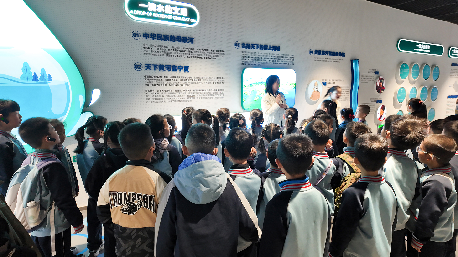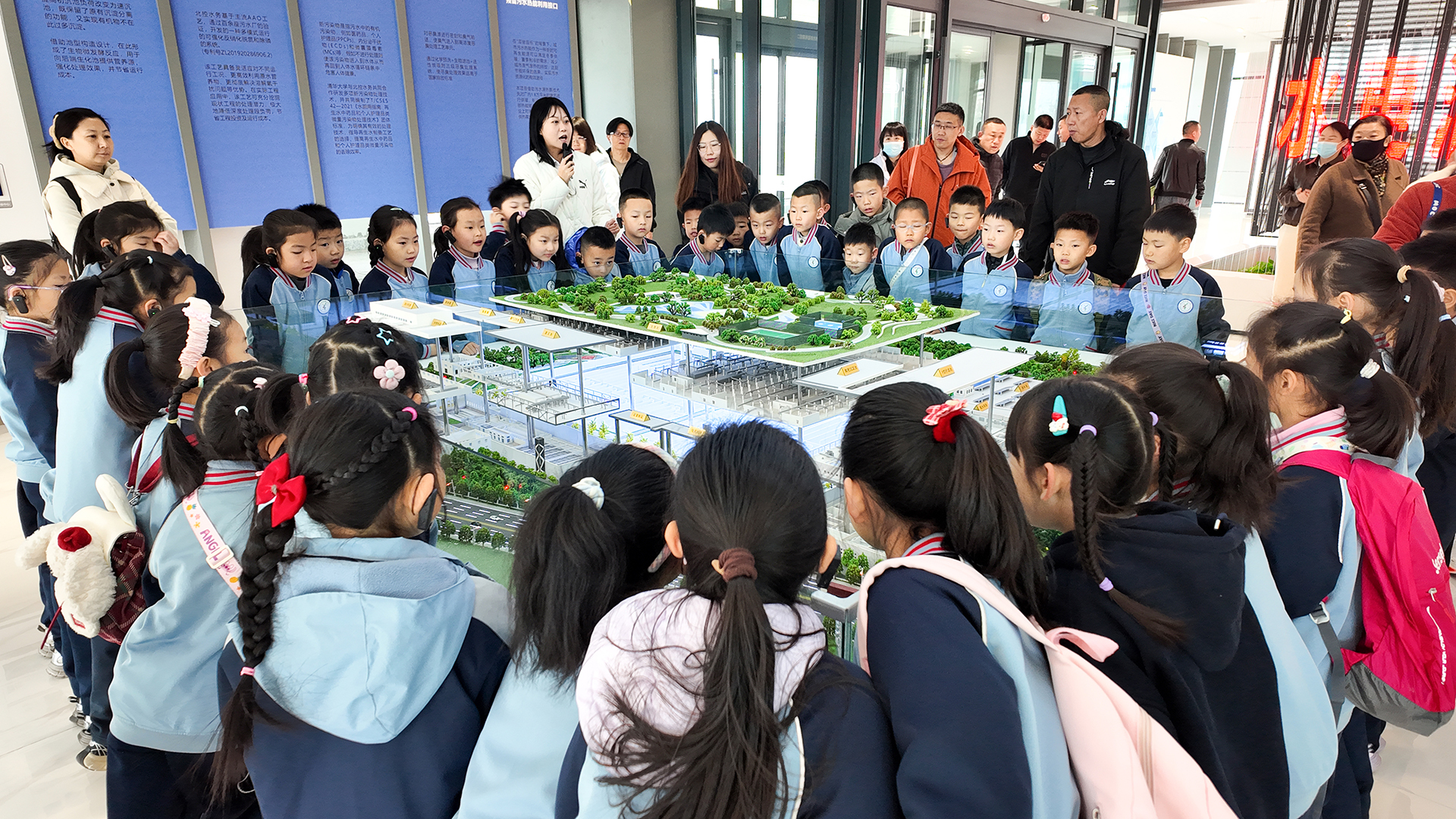 在政企共建展厅,同学们参观了银川市第一再生水厂全景沙盘,讲解员介绍了项目建设运营情况;在环保教育展厅,同学们通过“一滴水的文明”展区了解了黄河流域的水文明史,通过“一滴水的加工”了解污水由浊变清的神奇过程;在出水展示室,亲眼见证了清澈的再生水样。讲解员通过生动有趣的方式向同学们介绍了日常生活中切实可行的节水小妙招,鼓励同学们争当节水小能手。
